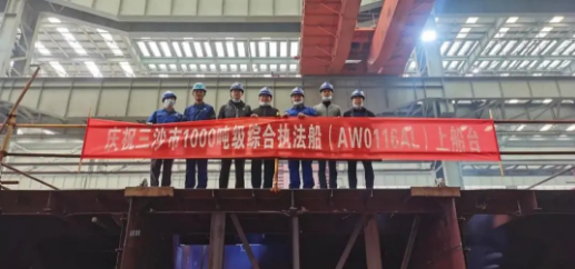 这是三沙市1000吨级综合执法船首制分段上船台,武船集团仅用12个工作日就保质保量完成了首制分段的制造及全部预舾装工作。